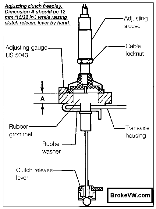 When you have a manual-adjust clutch cable, you want to adjust it so that there is play in the cable. VW specs call for 12mm between the clutch adjusting disk and the trans ledge it sits on. Here is a .mov movie showing the free play being checked by lifting the cable and arm up. You can see the arm get solid when it is level.