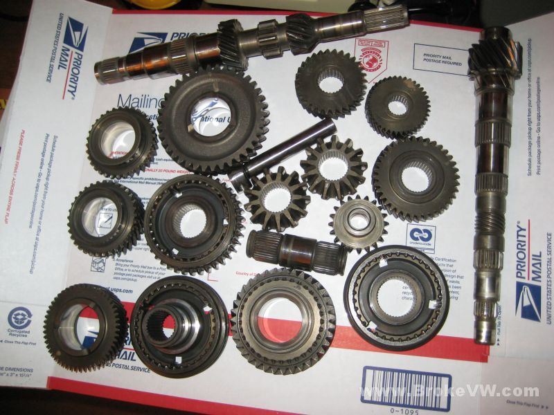 I've put your trans up on the bench, and have started taking it apart, everything is crazy tight on it. I have the 5th housing off, the shift linkage and trans mount arm off, the selector out, and have pulled the 5th gears off....
