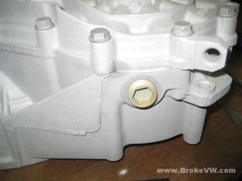 The wet spot around the plug is from the trace amounts of kerosene inside the case wicking out onto the very porous and dry surface of the trans. I normally coat the cases with light oil right after blasting, to protect it from oxygen and further corrosion, and also to allow an easy clean-up of any oily or greasy finger prints on the case during the build. Without the case being wet with the light oil, the dirt would get right onto the case, and stain it. The light oil keeps it off the case and easy to clean up.